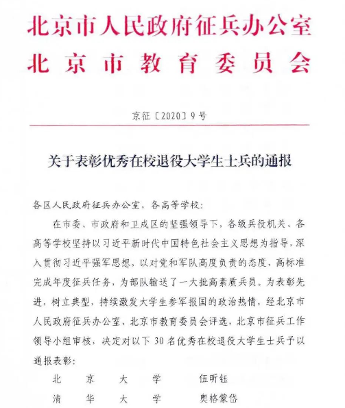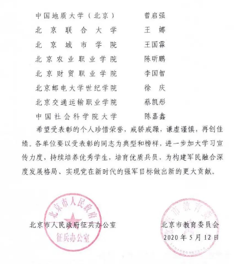 此次获评的北京市优秀退役大学生士兵,是从北京市64所高校推荐的80名在校退役大学生士兵中选拔而出。评选先后经过了高校推荐、资格审核、述优答辩、专家评审等环节,获评的每名学生均具有过硬的综合素质,在服役期间和退役返校后均有优异表现。