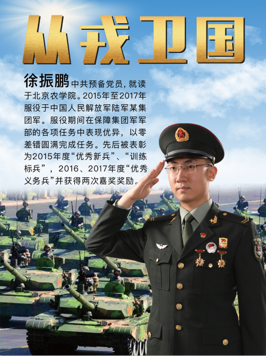 生命中有了当兵的历史,就深深镌刻了军人作风、军人精神、军人信仰,鼓舞着我在不同的人生阶段和岗位上,砥砺奋进、无私奉献。我将继续保持军人本色,回归校园回归社会,抒发自己别样的青春。
