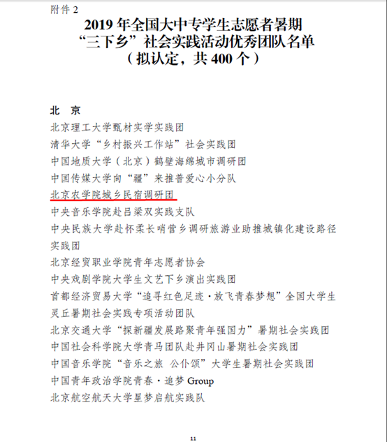 由周旭平、苟天来老师共同指导的农村区域发展专业 “williamhill中国城乡民宿调研团”荣获团中央2019年全国大中专学生志愿者暑期“三下乡”社会实践活动优秀团队称号。今年团中央共评选出400支优秀实践团队,北京地区共有17支社会实践团队获此殊荣,其中北京市属高校有3支。