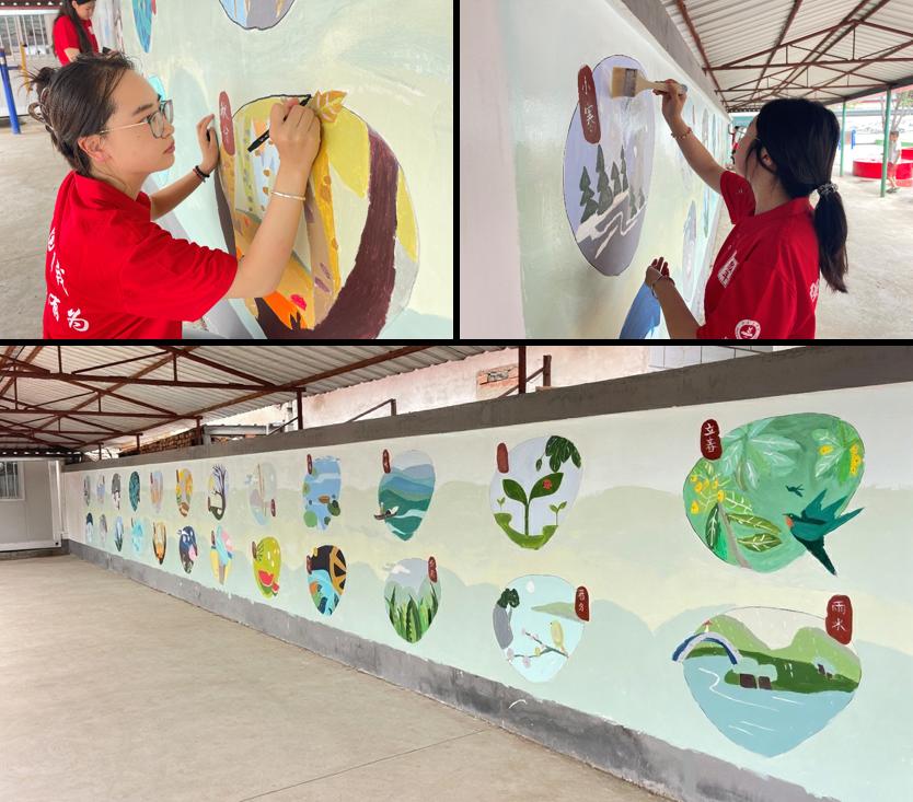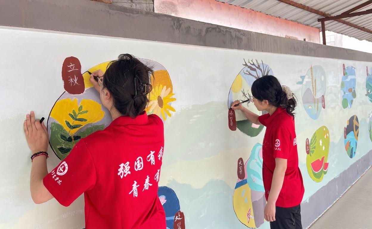 实践团充分发挥专业特长,以墙体为创作载体,将中国传统二十四节气文化融入乡村景观。从“立春”的生机盎然到“秋分”的丰收图景,24幅主题彩绘历时5天完成,总面积达120平方米。创作过程中,团队成员注重与村民互动交流,通过现场讲解让传统文化以更生动的方式走进百姓生活。刘家店镇驻村第一书记评价道:“这些作品既美化了村容村貌,更成为传播农耕文明、传承与弘扬中华优秀传统文化的新窗口,增强了寅洞村的文化自信。”
