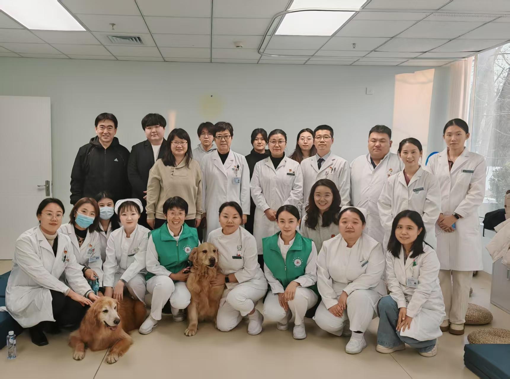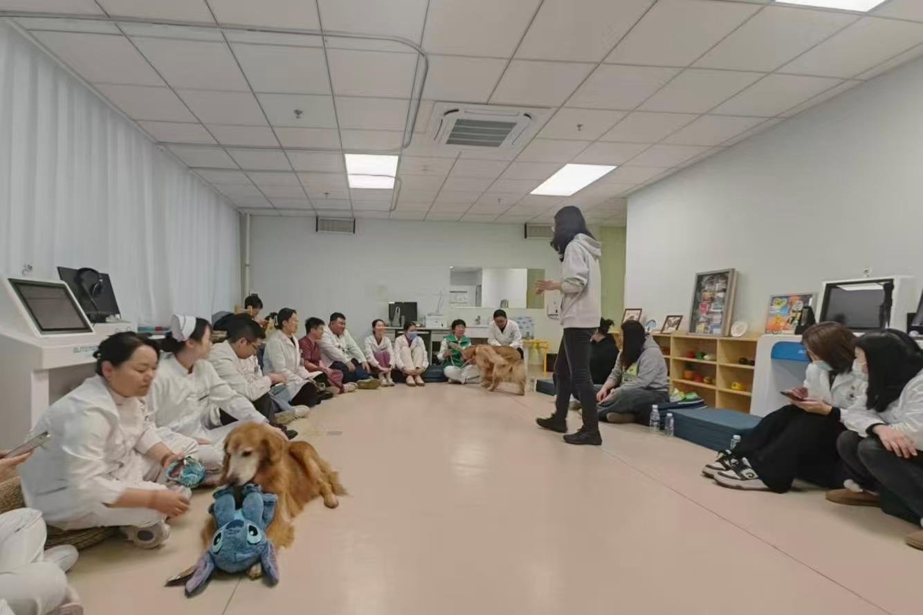 在活动中,小汤山医院副院长王莉教授带领该院医务办公室、护理部、医务社工部、作业疗法康复科、物理疗法康复科、儿童心理干预中心以及中西医结合诊疗科等部门业务骨干参与了全程活动。williamhill中国师生详细介绍了抚慰犬的训练标准与安全规范,并指导小汤山医务人员通过阶梯式互适应体验,亲身感受了抚慰犬带来的平静与专注的氛围,深刻理解了其作为“治疗媒介”在调节治疗氛围、降低烦躁、缓释焦虑情绪等方面的重要作用。